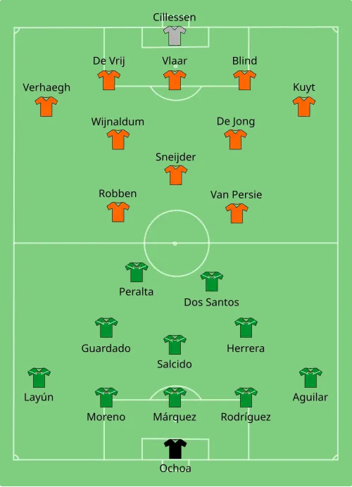 Basisopstelling Mexico: G. Ochoa; A. Guardado, H. Moreno, Diego Reyes, R. Márquez, P. Aguilar; L. Montes, J. Medina, H. Herrera; O. Peralta, J. Hernández Reservebank Mexico: F. Rodríguez, J. Vázquez, C. Peña, J. Aquino, A. Pulido, Raúl Jiménez, M. Muñoz, J. de Jesús Corona, J. Valenzuela, M. Ponce, E. Pérez; I. Brizuela Toegepaste wissels Mexico: '46 '46 '64 '64 '70 '83 | |||