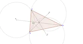 Neem de drie omgeschreven cirkels van de driehoeken HBC, AHC en ABH, waar H het hoogtepunt is van ABC. Dit zijn cirkels van Johnson, met middelpunten D, E en F. De middens van AD, BE en CF vallen samen in het midden van Johnson.