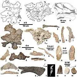 De kop is breed en gedrongen, zonder een sterk afhangende snuit. De snuitpunt is stomp en loopt voor een flink stuk verticaal op. Daarachter volt een recht stuk dat schuin oploopt naar het platte schedeldak. Hieronder bevindt zich een groot neusgat. Het voorhoofdsbeen maakt deel uit van de rand van het grote en brede bovenste slaapvenster, een zeer basaal kenmerk. De dwarskam op het achterhoofd is laag. De processus paroccipitalis is plat en schuin naar bezijden en iets beneden gericht, een basaal kenmerk. De tubera basilaria staan ver uit elkaar en worden aan hun voorste basis niet begrensd door een dunne beenwal overdwars als scheiding tussen de holten op de onderkant van de hersenpan. De buitenhoek van deze aanhangsels is naar voren geknakt, wat ze in onderaanzicht een L-vorm geeft, net als bij Moabosaurus. De kop van het quadratum is sterk naar achteren gebogen.