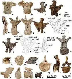 De achterste ruggenwervels zijn amficoel, aan voorzijde en achterzijde hol, in plaats van opisthocoel, met een bolle voorkant. Deze wervels hebben verder de eigenaardigheid dat de richel die van het zijuitsteeksel naar het doornuitsteeksel loopt zich splitst zodat een voorste tak de voorliggende holte deelt. Er zijn vijf typen sacrale ribben gevonden zodat men geconcludeerd heeft tot vijf sacrale wervels. De beenplaat op de bovenkant van de sacrale rib heeft een opvallende groeve aan de binnenste onderkant die de plaat scheidt van de achterkant van de verbinding met het heiligbeen.