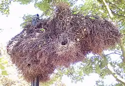 Deze kolonievogels nestelen in vrij grote groepen. Ze bouwen zeer grote vrijstaande nesten, die een diameter hebben van wel een meter. De binnenzijde van de nesten zijn bedekt met zachte grasstengels, het overige bouwwerk wordt gemaakt van takken. In een boom bevinden zich vaak meerdere nesten en elk nest wordt vaak door meerdere paartjes bewoond. Elk paartje heeft in zo'n nest zijn eigen kraamkamer. Ook buiten de broedtijd worden de nesten door de vogels bewoond.