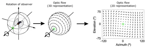 Optische stroom of optisch stroomveld is het patroon van schijnbare beweging van objecten, oppervlakken en randen in een visuele scène, veroorzaakt door de relatieve beweging tussen een waarnemer en een scène.[7][8] Optische stroom kan ook worden gedefinieerd als de verdeling van schijnbare snelheden van beweging van helderheidspatronen in een afbeelding.[9] Voorbeelden zijn optische expansie, bewegingsparallax, monoculaire stereopsis en het kinetische diepte-effect.