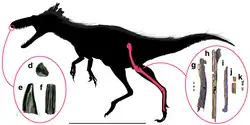 De achterpoot is relatief langwerpig. Het dijbeen is aan beide uiteinden zwaar beschadigd. De binnenholte is groot en de botwand dun. Het heeft een bollende kam aan de achterste binnenkant onder het niveau van de trochanter minor, net als bij Dryptosaurus, Bistahieversor en Gorgosaurus. Een basaal kenmerk is een extra trochanter uitlopend van de trochanter minor, net als bij Guanlong, Dilong en Xiongguanlong, vlak bij de onderscheidende bult. Een driehoekige vierde trochanter aan de binnenste achterkant geeft het dijbeen als geheel een D-vormige dwarsdoorsnede waarvan het platte achtervlak is ver naar beneden doorzet, begrensd door de linea intermuscularis caudalis en de crista supracondylaris medialis. De vierde trochanter heeft een dubbele punt.