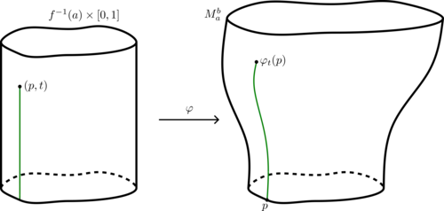 Men bekomt een diffeomorfisme door op te merken dat er ook geen kritieke punten van in liggen, voor een zekere . Vervolgens kan de strook uitgerokken worden tot de strook , ook door middel van een genormaliseerde gradiëntstroom. Dit diffeomorfisme wordt dan geplakt aan de identiteit op om een diffeomorfismete bekomen[4].