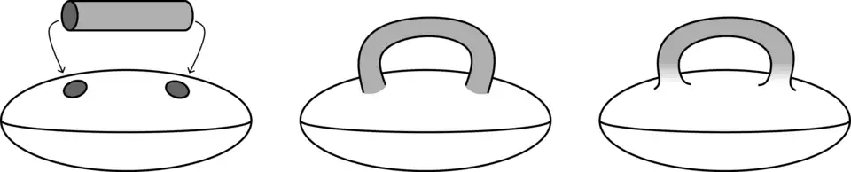 Een handvat van dimensie en index , ook wel een -handvat genoemd, is een ruimte die diffeomorf is met het product , waarbij de gesloten -dimensionale eenheidsbol is. De deelruimte wordt de kern van het handvat genoemd en de deelruimte de cokern. De rand van een -handvat valt op natuurlijke wijze uiteen in twee delen: Een handvat kan worden geplakt aan een variëteit door middel van een (gladde) inbedding . De adjunctieruimte is de ruimte die verkregen wordt door het handvat langs aan te plakken. Deze heeft een op diffeomorfisme na unieke gladde structuur waarvoor de kanonieke afbeeldingen en (gladde) inbeddingen zijn[5]. Het is gebruikelijk om een adjunctieruimte zoals met hoeken te tekenen indien ze niet van een gladde structuur voorzien is (zie de onderstaande figuur). Het uitbreiden van de structuur van van een topologische ruimte naar een gladde variëteit wordt afgladden genoemd.