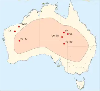 Verspreidingsgebied van de nachtpapegaai. Rode stippen geven de laatste waarnemingen weer tussen 1979 en 2006.
