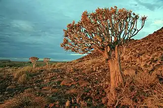 In de regio van de Brandberg gaat de mopane-savanne over in de overgangszone tussen savanne en halfwoestijn. Algemene bomen in dit gebied zijn de kobas (Cyphostemma), bauhinia (Adenolobus), kokerboom (Aloe dichotoma) en de spookboom (Moringa ovalifolia). Verschillende acaciasoorten komen ook voor, zoals de Brandberg-acacia (Acacia montis-ustii), A. robynsiana, A. senegal en de A. tortilis.