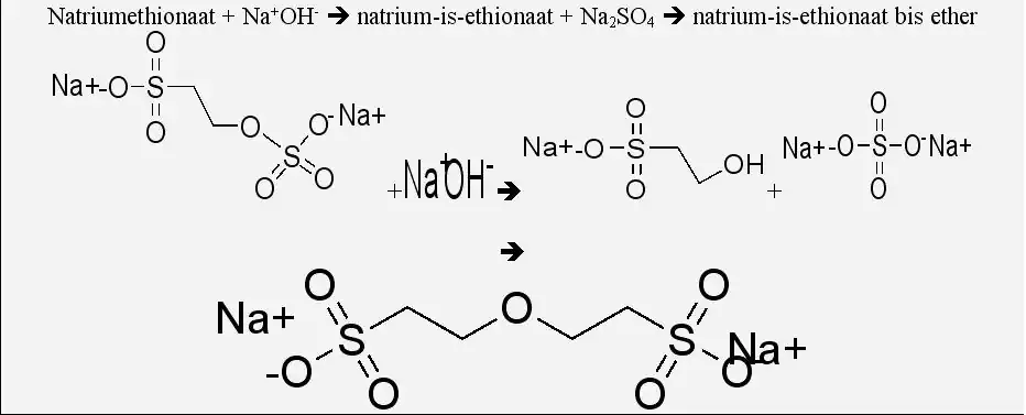Eerst worden twee natriumhydroxide moleculen aan het ethionzuur toegevoegd, hetgeen leidt tot natriumethionaat.