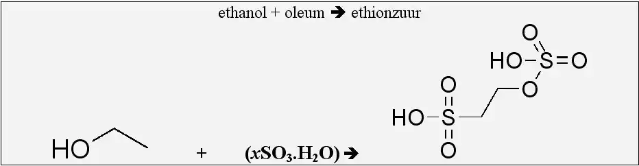 Een eerste stap is het vormen van ethionzuur aan de hand van ethanol en oleum (rokend zwavelzuur).