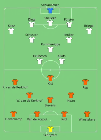 Op 14 juni volgde de confrontatie tegen West-Duitsland. Doelman Schrijvers keerde terug in het elftal, maar oogde bij momenten onzeker. In de aanval verloor Vreijsen zijn plaats aan Johnny Rep. Nederland was niet opgewassen tegen de West-Duitsers. Spits Klaus Allofs bracht zijn land met een hattrick 3-0 voor. Met nog zo'n tien minuten te spelen kreeg Nederland een lichte strafschop. Invaller Lothar Matthäus, die in deze wedstrijd debuteerde, beging een overtreding op de doorgebroken Ben Wijnstekers. Hij deed dat buiten het strafschopgebied, maar de Franse scheidsrechter Robert Wurtz legde de bal toch op de stip. Rep zette de penalty om. In de slotminuten scoorde Willy van de Kerkhof nog een tweede doelpunt voor Oranje.