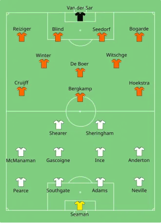 In de laatste groepswedstrijd trof Oranje gastland Engeland. Hoewel het begin van de wedstrijd tegen Zwitserland geen groot succes was, koos Hiddink, die weliswaar niet langer op Davids kon rekenen, voor dezelfde elf basisspelers. Seedorf nam opnieuw plaats naast Blind, maar de twee centrumverdedigers bleken niet opgewassen tegen de Engelse aanvalsgolven. Blind maakte na twintig minuten een strafschopovertreding op Paul Ince.[6] Spits Alan Shearer zette de penalty om. Tijdens de rust werd Witschge gewisseld door De Kock. De verdediger ging op de positie van linksachter spelen, waardoor Bogarde op het middenveld belandde.[7] De tactische ingreep bleek geen succes. Oranje incasseerde na de rust in tien minuten tijd drie doelpunten en was daardoor zo goed als zeker uitgeschakeld. Uiteindelijk kon het team van Hiddink via invaller Kluivert toch nog voor een treffer zorgen. Op basis van het aantal gemaakte doelpunten kon Nederland in het klassement beslag leggen op de tweede plaats.