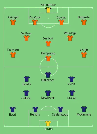 Nederland creëerde tegen Schotland voldoende kansen, maar kwam niet tot scoren. Vooral de afronding van Bergkamp liet te wensen over.[2] Na iets meer dan een uur spelen bracht Hiddink met Patrick Kluivert een extra centrumspits in, maar ook dat leverde niets op. Het duel eindigde op 0-0.