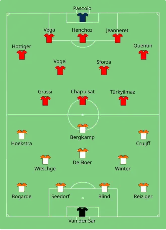 In de kwartfinale moest Nederland het opnemen tegen Frankrijk. Seedorf, die in de duels tegen Zwitserland en Engeland bewees geen geboren centrumverdediger te zijn, belandde op de bank. Zijn plaats werd ingenomen door De Kock. In de spits mocht Kluivert in de basis starten. Daardoor werd Bergkamp de schaduwspits, verhuisde De Boer opnieuw naar de rechterzijde en viel Winter naast het elftal. Ook Phillip Cocu mocht voor de eerste keer in de basis starten. Hij verving linksbuiten Peter Hoekstra.