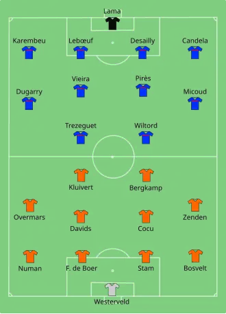 Voor het derde duel van de groepsfase werd de Nederlandse verdediging op verschillende plaatsen gewijzigd. Stam keerde terug in de plaats van Konterman en de geschorste Van Bronckhorst werd vervangen door Numan. Op de rechterflank kreeg Paul Bosvelt zijn eerste speelminuten. Zowel Nederland als Frankrijk was al gekwalificeerd voor de kwartfinale, enkel groepswinst stond nog op het spel. De Fransen lieten onder meer Zinédine Zidane, Didier Deschamps, Fabien Barthez, Laurent Blanc en Lilian Thuram rusten.[5] Oranje won het prestigeduel met 2-3 na doelpunten van Kluivert, Frank de Boer en Zenden.