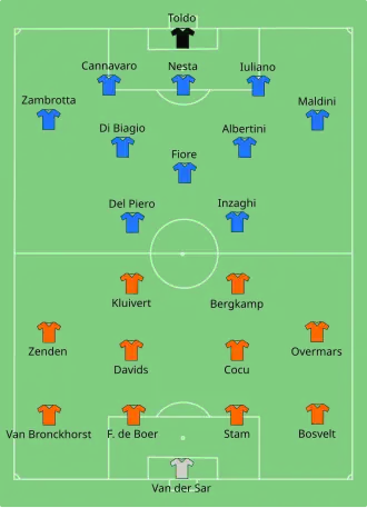 In de halve finale trof Nederland de winnaar van groep B, Italië, dat in de kwartfinale met 2-0 van Roemenië had gewonnen. Oranje startte het duel met Van Bronckhorst als linksachter. Op het middenveld wisselden Zenden en Overmars van flank.