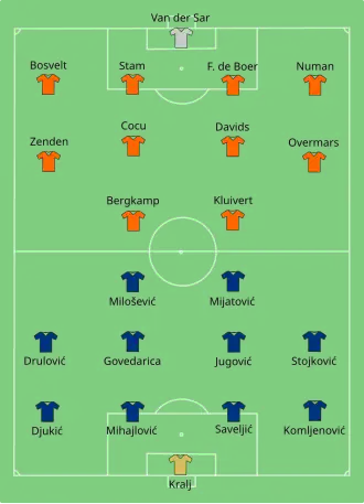 De wedstrijd werd met 6-1 gewonnen. In de eerste helft nam Nederland een 2-0-voorsprong door doelpunten van Kluivert. In de tweede helft werd de score uitgebreid door een eigen doelpunt van Govedarica (aanvankelijk werd de treffer aan Kluivert toegewezen), een derde doelpunt van Kluivert en twee doelpunten van Overmars. In blessuretijd scoorde Milošević namens een zwak Joegoslavië de 6-1.[6] Door de hattrick werd Kluivert de topschutter van het EK.