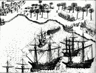 Afbeelding van de vloot waarmee Cornelis Matelieff de Jonge in 1606 bij Malakka landde
