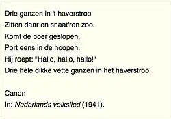 De bundel Nederlands volkslied sluit af met een ruime verzameling canons, zoals: Hemel en aarde kunnen vergaan; Zomer is 't in bos en velden; Drie ganzen in het haverstro; en Ontwaak ontwaak, de roep van de haan.