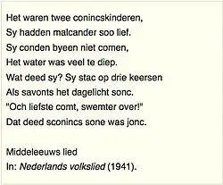 - 1 2 Alle liedjes in dit artikel worden aangeduid met het incipit (de beginregel) - en dus niet met de titel. Dit is gebruikelijk in het historische liedonderzoek om drie redenen. Ten eerste: liedjes uit de orale traditie hebben geen vaste titel; de titel kan hierdoor in elk liedboekje verschillen. Ten tweede: veel titels zijn niet onderscheidend: er zijn vele liedjes met titels als Meilied, Het vogeltje, Avondliedje, Herfstliedje of Een nieuw sinterklaaslied. En ten derde maakt de titel geen onderdeel uit van het lied; het incipit identificeert het lied, voor iedereen die het kent, met inbegrip van de melodie. Bijvoorbeeld: de titel Een oud kerstliedeken is willekeurig èn niet onderscheidend; het incipit De herdertjes lagen bij nachte identificeert één specifiek lied.