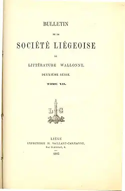 - ↑ (fr) Lequarré, Nicolas, Li manôye å vî Payi d' Lîdje - Un texte scientifique en wallon en 1907. Bulletin du Dictionnaire général de la langue wallonne, Tome IIème. Société Liégeoise de Littérature wallonne (1907).