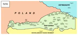 De naam verwijst naar Serviërs die in 1752 van de Militaire Grens van het Habsburgse Rijk naar het Russische Rijk emigreerden. De Russische autoriteiten gaven de Serviërs een apart grondgebied die na de Oostenrijkse Successieoorlog de naam Nieuw-Servië kreeg. Net zoals de Militaire Grens aan de Pannonische grens organiseerden de Serviërs het gebied als een militair territorium aan de Russisch-Poolse grens op het gebied rond Buhogard van de Zaporizhian Sich. Het doel van deze politiek was om de zuidgrens van het Russische Rijk te verdedigen en te participeren in Russische militaire operaties. De president van Nieuw-Servië was Jovan Horvat, die onderdeel uitmaakte van de Oostenrijkse grensinfanterie. In 1764 ging het gebied op in het Gouvernement Novorossiejsk waarbij er een einde kwam aan de aparte Servische militaire positie in het Russische rijk. In de tijd van Nieuw-Servië werden de dorpen Subotsi, Moshoryne, Hostynne en anderen gesticht