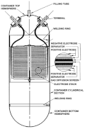 De kathode bestaat uit een gesinterde poreuze nikkelplaat met nikkelhydroxide, de negatieve waterstof-elektrode is een teflongebonden platinazwart katalysator, het scheidingsvel is in het algemeen een asbestpapier of onbehandeld Zircardoek.[2]
