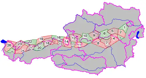 De volgende bergketens behoren tot de Noordelijke Kalkalpen. De nummers vooraan corresponderen met de nummers op de kaart rechts.