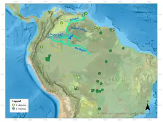 | verspreidingsgebied van Eunectes akayima (lichtgroen) en Eunectes murinus (donkergroen) | ||||||||||||||||||