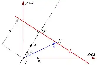 In het euclidische vlak, , is een lijn gegeven. De steunvector staat loodrecht op de lijn. De eenheidsnormaalvector op de lijn is de vector met lengte . Daarvoor geldt: