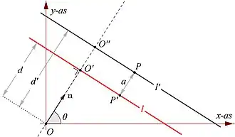 Is de afstand van tot gelijk aan en die tot gelijk aan , dan zijn de hesse-vergelijkingen van die lijnen: