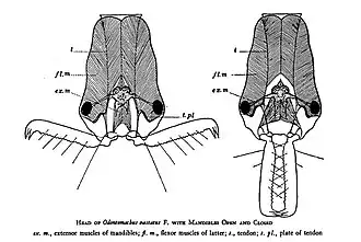 | schematische tekening van de kop van Odontomachus hastatus met bek open en dicht | ||||||||||||||||