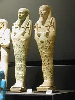 In het Nieuwe Rijk werd op de grafbeeldjes ook een formule, hoofdstuk zes van het Egyptisch Dodenboek, geschreven: