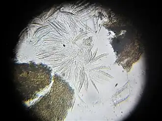 De asci 8-sporig, cilindrisch tot knotsvormig en ongeveer 60-95 µm lang. Ze gerangschikt in bundels. De pseudoparafysen, dunne filamenten die tussen de asci liggen, zijn ongeveer 1-1,5 µm breed. De ascosporen zijn hyaliene, langwerpig en 35-45 µm lang. Ze hebben 7-10 septa en zijn voorzien van kleine druppeltjes, enigszins taps toelopend aan de uiteinden.