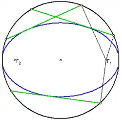 Neem een cirkel en een vast punt binnen die cirkel. We laten een punt over de cirkel lopen. De lijnen door loodrecht op raken aan een ellips met als een van de brandpunten en de middellijn van de cirkel door als lange as. De ellips is dus de omhullende.