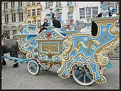 - De praalwagen van de Lisbloem. De Lisblomme speelde haar rol in de Mechelse toneelwereld in de schaduw van de Peoene. De wagen van 1875 is in Renaissancestijl en vervoert ‘zes maagden’. Vooraan zit de Zot.