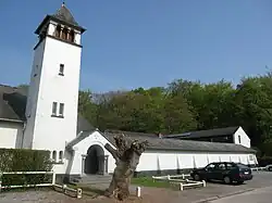 Het betreft een witgeschilderd gebouwencomplex met een kapel en daaraan vastgebouwd een L-vormig klooster. Via een rondboogportaal betreedt men het complex met links de kapel welke een vierkante toren bezit. De glaswand met blauwige glazen werd vervaardigd door Frans Crickx en Ovide Piron.