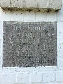 De toewijding aan Sint-Christoffel verwijst naar de Vlezenbeekse auto-motoclub die met giften heeft bijgedragen aan de realisatie van de kapel. In de rechterzijgevel bevindt zich een arduinsteen met de tekst: O-L-Vrouw van Loretten, bescherm ons, auto-motoclub Vlezenbeek I-XI-1950.