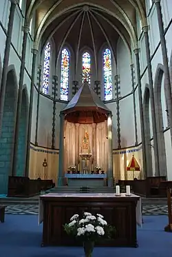 Het kerkgebouw is een neogotische bakstenen kruisbasiliek met slechts een lage toren naast het koor, die ontworpen is door Edmond Jamar. Achter het koor ligt het klooster, dat in carré werd gebouwd.
