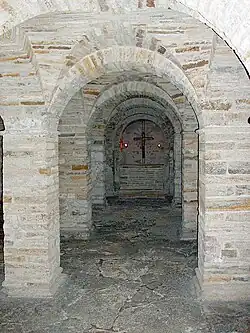 De crypte onder het koor ontstond vermoedelijk kort na 1060, toen de houten domkerk tijdens een aanval van de Noorse koning Harald III werd platgebrand. Op een onbekend moment werd de toegang van de crypte, waarover inmiddels een kerkschip en koor was gebouwd, gesloten. De oude kerkzaal onder de kerk raakte vervolgens in de vergetelheid en werd pas in 1955 herontdekt. Twee jaar later werd de gewelfde ruimte weer ingewijd en sindsdien worden er regelmatig bijzondere kerkdiensten gevierd. Het romaanse kruisbeeld boven het altaar is een kopie van het kruisbeeld uit de kerk Gammel Åby, het origineel bevindt zich in het Nationaal Museum te Kopenhagen.