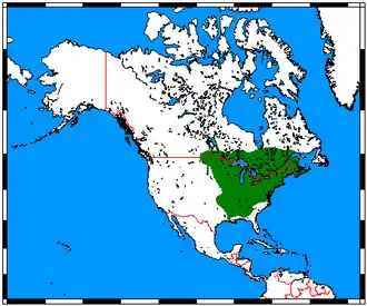 Het verspreidingsgebied omvat Zuidoost-Canada en het centrale en oostelijke deel van de Verenigde Staten. De noordgrens loopt van Zuid-Manitoba tot Nova Scotia, oostgrens door het oosten van North Dakota en Oklahoma, en de zuidgrens door Mississippi, Noordwest-South Carolina en Virginia.