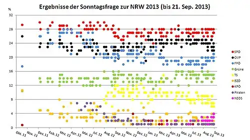 | Gallup/Österreich[dode link] | 13-09-2013 | 28% | 25% | 20% | 15% | 7% | 1% | 3% | 1% | - | - |