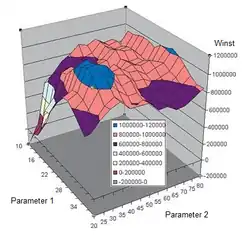 De resultaten van een optimalisatie kunnen worden gevisualiseerd in een grafiek. In bijgaande 3D grafiek vormen de twee systeemparameters beide horizontale assen. De behaalde winst staat afgebeeld op de verticale as. De beste parametercombinaties worden vaak gevonden in gebieden met brede en afgevlakte toppen (het blauwe gebied in de grafiek).