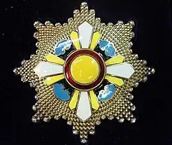 De orde kende meerdere graden. Het versiersel was een geel en wit geëmailleerd bloemenkruis met in het hart een groot geel medaillon. Tussen de armen van het kruis zijn blauwgeëmailleerde wolken aangebracht.