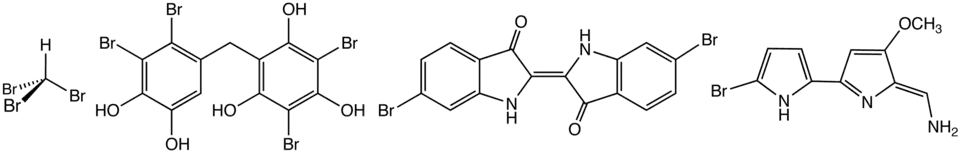Structuurformules van een aantal natuurlijke organobroomverbindingen. Van links naar rechts: bromoform, een gebromeerd bisfenol, dibroomindigo (“Koninklijk Purper”) en het anti-eet-hormoon tambjamine B.
