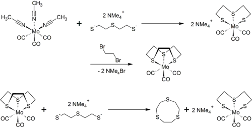 Organomolybdeenverbindingen vinden onder andere toepassing in de synthese van kroon(thio)ethers, zoals het voorbeeld van 9S3 laat zien. Het molybdeencarbonylcomplex zorgt ervoor dat de verschillende zwavelatomen ten opzichte van elkaar in de goede positie staan voor de reactie.[2]