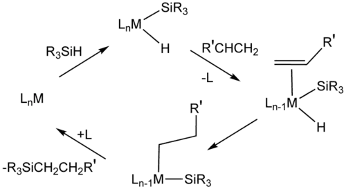 Voor de hydrosilylatie is H2PtCl6 ("Speiers katalysator") belangrijk. Mechanismen die voor deze reactie worden voorgesteld gaan meestal uit van de liganden hydride, silyl (R3Si) en een alkeen.[8] Cis-dichloorbis(di-ethylsulfide)platina(II) en Karstedts katalysator (een adduct van divinyltetramethyldisiloxaan en chloorplatina(IV)zuur) zijn in staat de hydrosilylatie te katalyseren.[9]