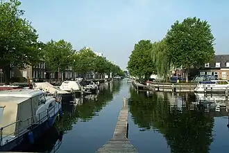 Zicht over de havenbuurt en het centrum van Veghel, met rechts de havenkom aan het Heilig Hartplein, omstreeks 1973