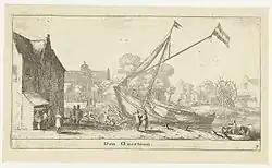 Aan het eind van de Heiligewegsevaart in de Schinkel ligt een dam met een overhaal: de Overtoom. Links: het Leydse Veerhuis. Ca. 1610.