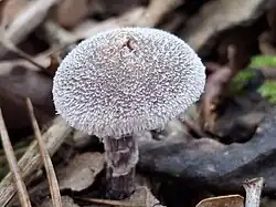 De hoed is spits, donker violetbruin, geheel bedekt met kleine witte schubjes.[3] De hoed heeft een diameter van 10 tot 40 mm.