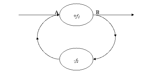 In dit proces is A de gewenste waarde (van links komende). A min de teruggekoppelde waarde (via de cirkel komende vanaf B), is de input op de functie +f1: het "foutsignaal". In functie +f1 worden berekeningen uitgevoerd. B is de in te stellen waarde. A zou eigenlijk in de ideale situatie gelijk moeten zijn aan B. Het foutsignaal, mede door de teruggekoppelde corrigerende waarde (via functie -f2) verkregen, is dan in dat geval nul. Bij een afwijking is dus de correctie negatief. Daardoor kan de situatie bestaan dat B gelijk wordt aan niet B: dat is een paradox. Als het goed getimed is en goed gedimensioneerd, leidt dit tot een stabiel systeem in plaats van een tegenstrijdigheid. Dankzij de vertraging in het systeem is dan nooit exact gelijktijdig B gelijk aan -B. Echter, als de vertraging te klein is, wordt het systeem instabiel. Dan kan dit proces gebruikt worden als oscillator. B en -B en --B en ---B enz. enz. volgen elkaar dan in de tijd op: slingeren of oscilleren.